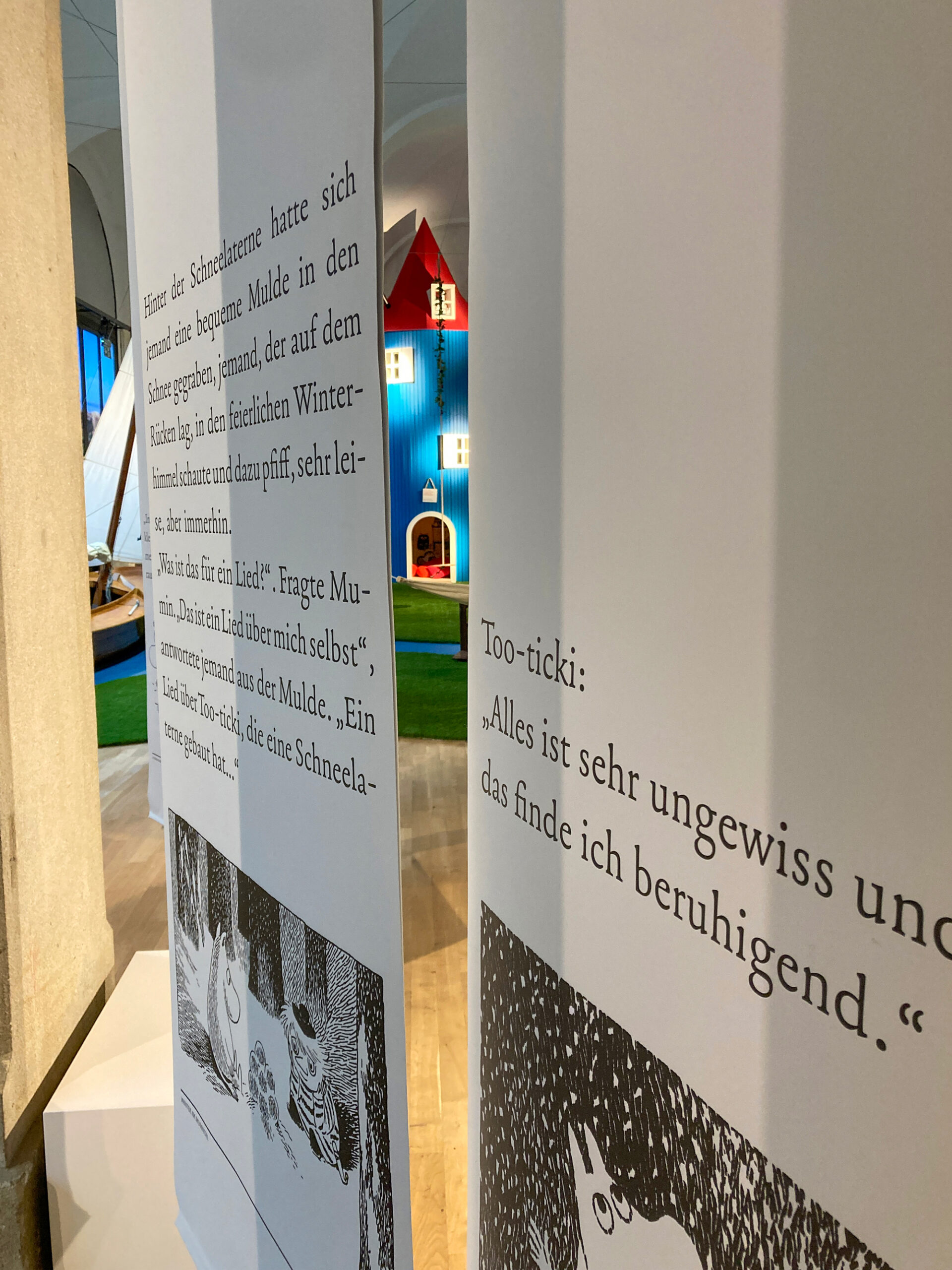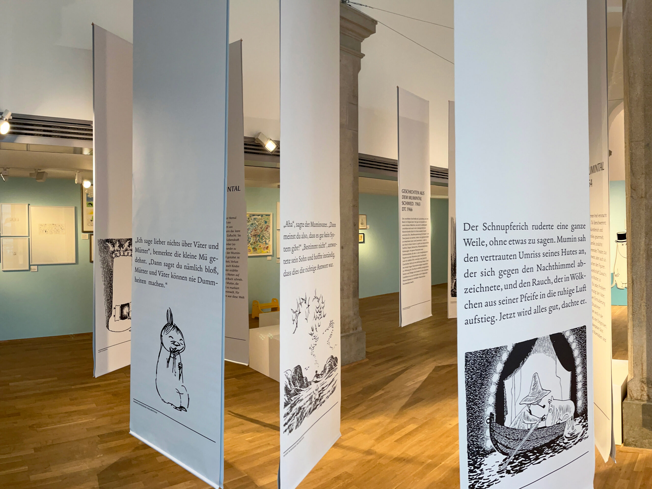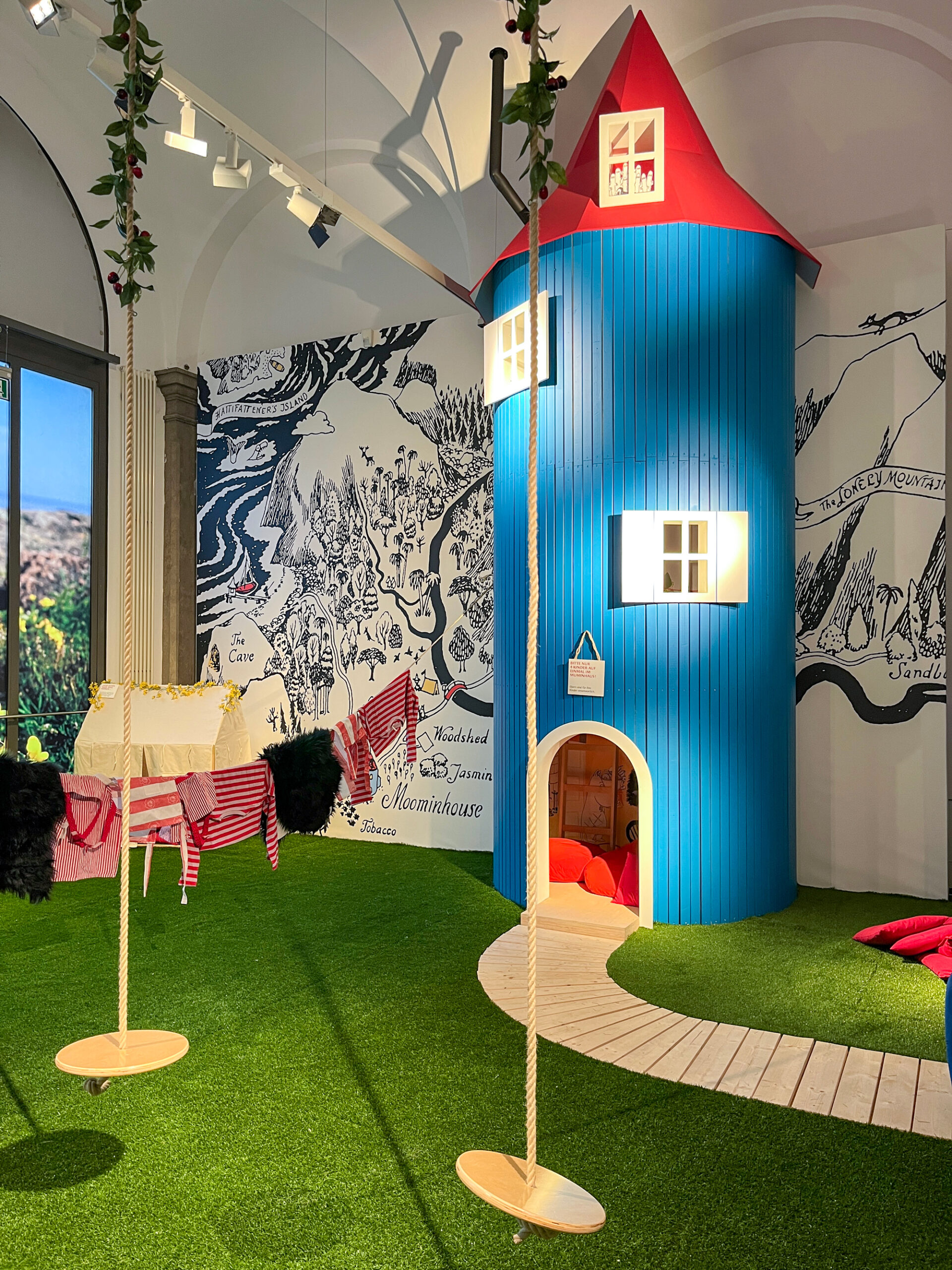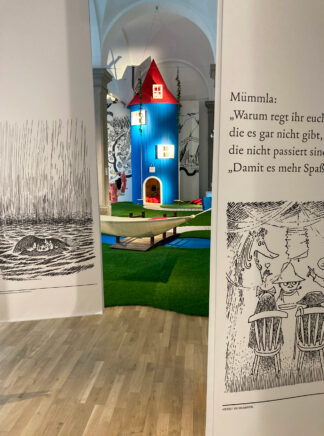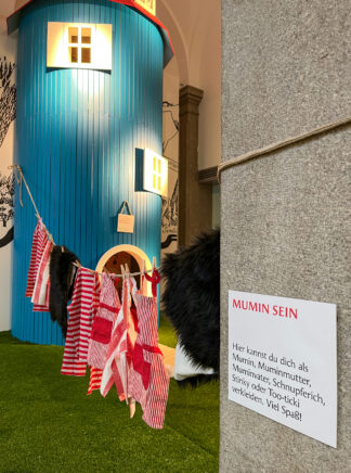 Viel gibt es zu erfahren über die wichtige finnische Künstlerin Tove Jansson, deren Geschichten und einmalige Illustrationen im Mittelpunkt der Ausstellung stehen. Gleichzeitig werden die in den Büchern vermittelten Werte und die viele Emotionen für die Kinder unmittelbar und spielerisch erlebbar gemacht. Eine kleine Muminwelt mit Schiff und Brücke, Haus und Höhle lädt zu Entdeckungen ein. Es darf gespielt werden, gemeinsam, zusammen, rücksichtsvoll und manchmal braucht man dazu sogar ein bisschen Mut. Es wird vorgelesen und geschaukelt, geklettert und gelesen. Eine Welt für alle!